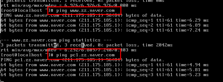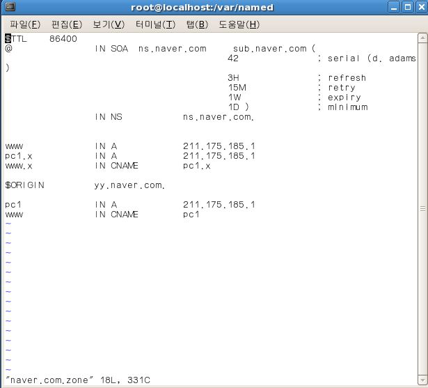 서브 도메인의 존 파일은 naver.com.zone과 같은 디렉토리(/var/named/)에 보존하고 기술내용은