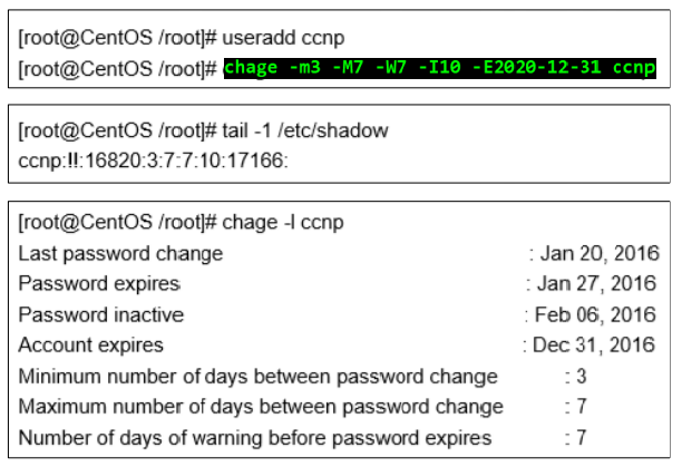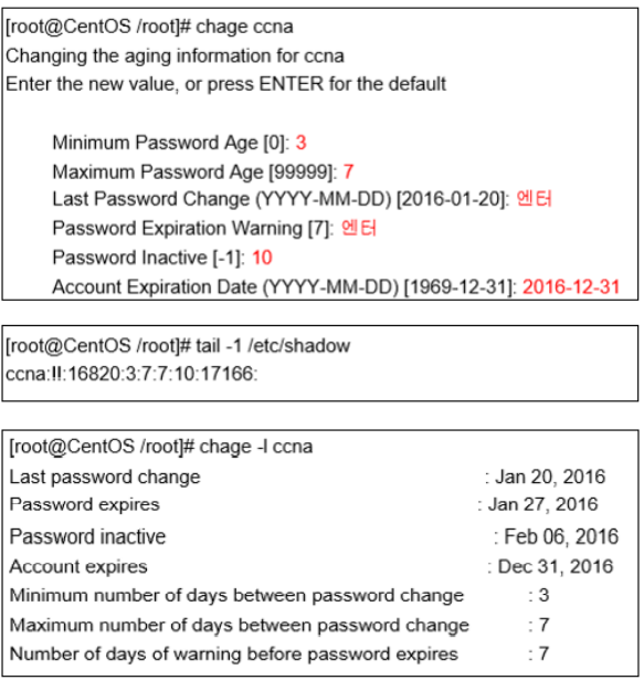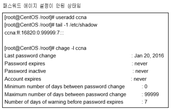 주기적으로 패스워드를 강제로 변경하기 위해서 사용하는 설정이다. 현재 ccna계정은 암호최대변경주기가 99999일이기 때문에