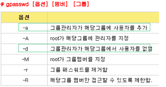 . gpasswd 명령은 단순히 그룹의 암호를 설정하는 것뿐만 아니라 그룹의 암호를 삭제하 그룹에 멤버를 추가하거나 삭제하는 기능도 수행한다.