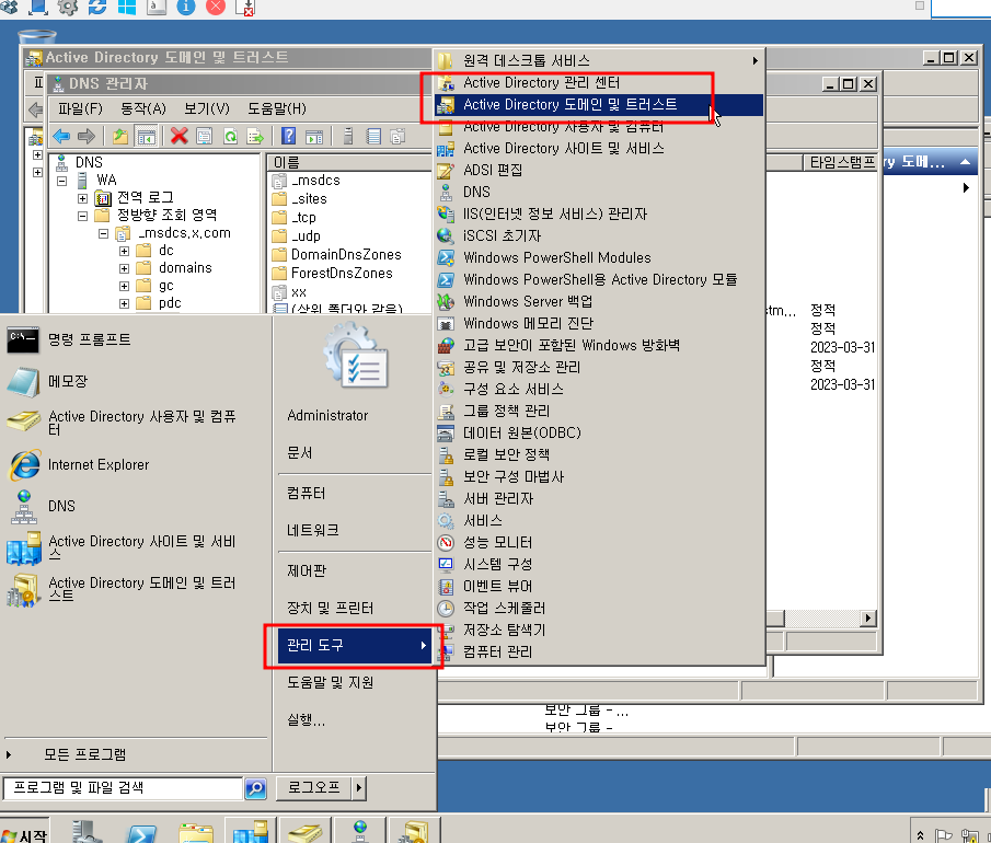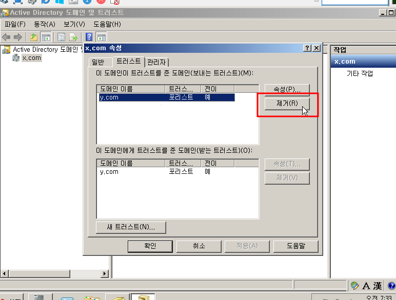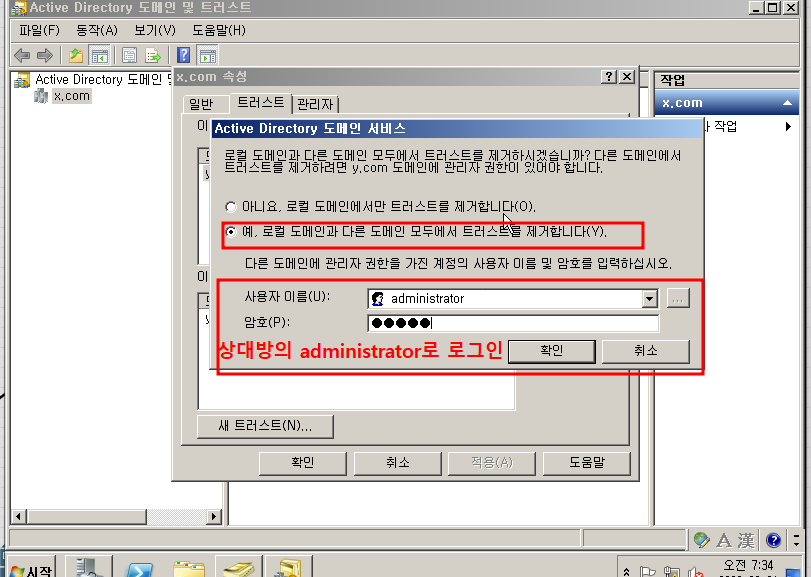 한쪽에서 로컬 도메인과 다른 도메인 모두 제거하기 하고, 상대방의 administrator로 로그인해준다.