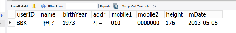 INSERT INTO usertbl VALUES('BBK', '바비킴', 1973, '서울', '010', '0000000', 176, '2013-5-5');