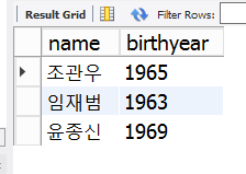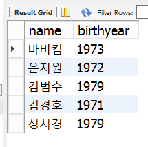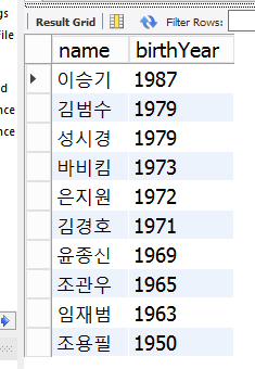 select * from usertbl limit 5; -- 5개까지만 가져오기