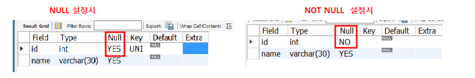 - NOT NULL : NULL값을 가지면 안되는 컬럼
