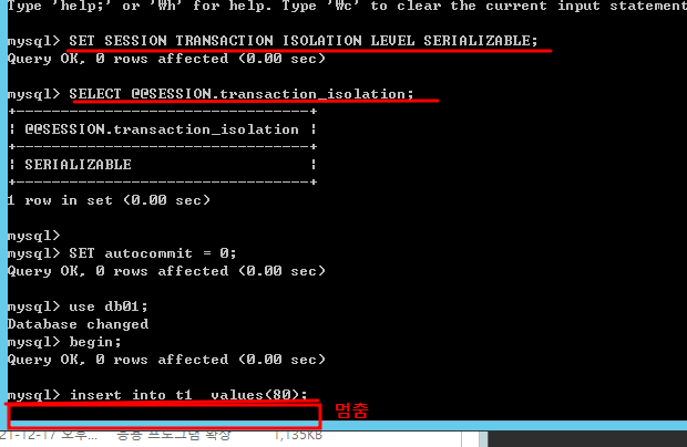 USE DB01; BEGIN; INSERT INTO T1 VALUES(80); => 작동을 멈추게 됨 |