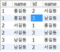 - 한 테이블의 모든 행과 다른 테이블의 모든 행이 연결되는 모든 경우를 반환