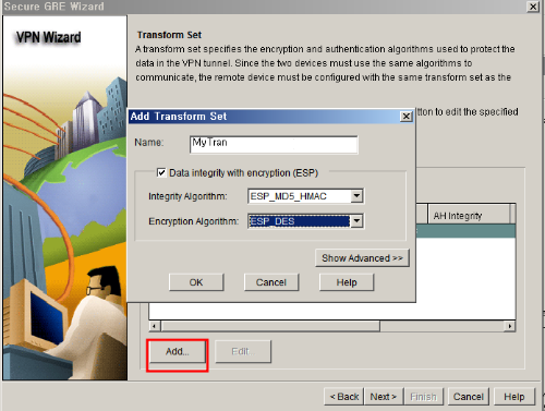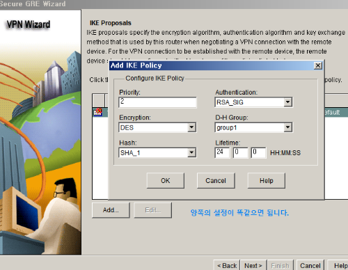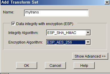 암호화 정책의 종류를 선택해줍니다. 이것도 터널 양쪽의 설정을 똑같이 맞춰주어야 합니다.