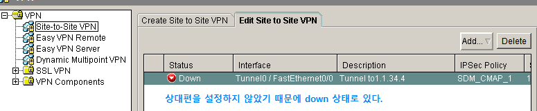 반대편 터널의 설정이 되지 않았기 때문에 status가 down으로 내려가 있습니다. 반대편 터널의 설정을 똑같이 해주면