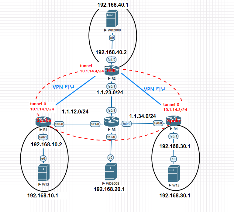 ※ 참고 기존의 GRE 터널은 1개의 터널 인터페이스마다 1개의 GRE 터널을 사용하지만, MGRE 터널은 1개의 터널 인터페이스마다 여러 개의 GRE 터널을 사용할 수 있어서 MGRE 터널을 이용하면 설정 작업이 줄어들어 서 편하다.