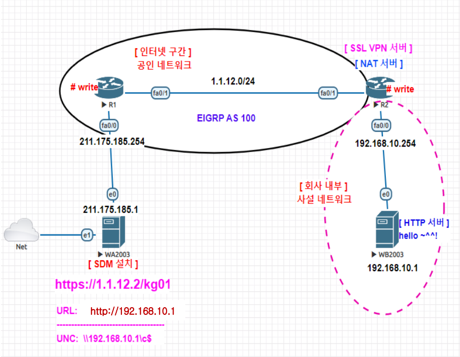 일반적으로 SSL VPN의 운용은 서버를 두고 여러 클라이언트(PC,스마트폰 등) 웹 브라우저를 통해 메인 서버에 접근하고 인증을 통 과하면 사설망이 구성되는 방식이다.