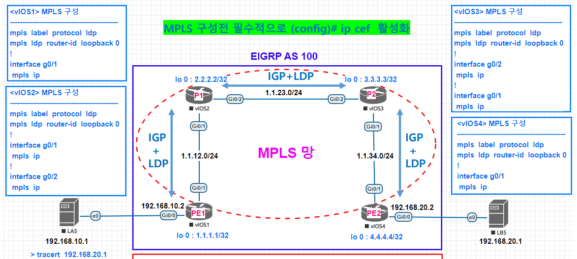 mpls ip => mpls 가 동작할 interface 지정 CE-FE 구간은 interface 지정 X