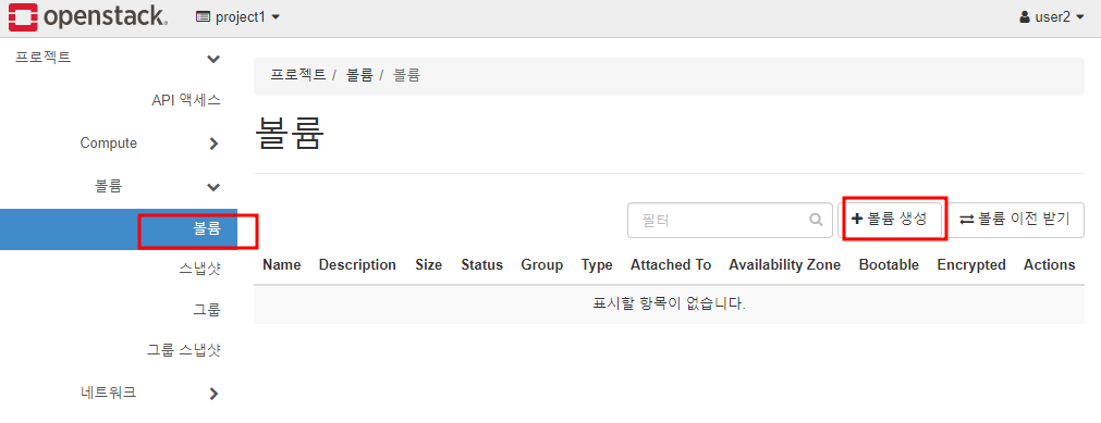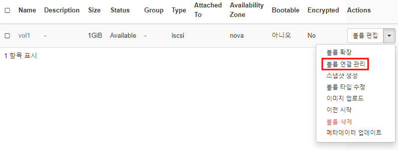 스텝17. Project > Volumes > Volumes > vol1 > Manage Attachments