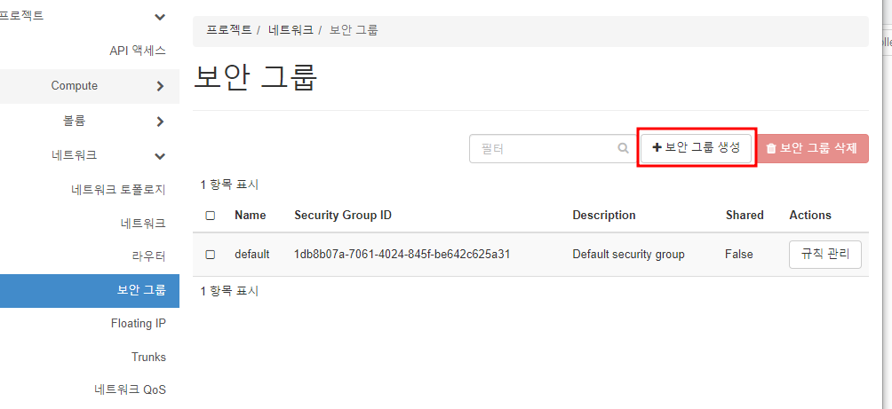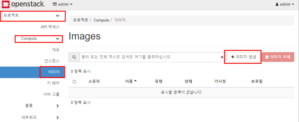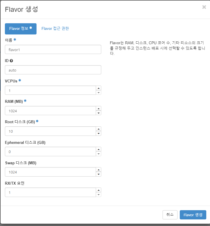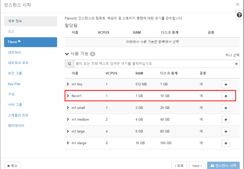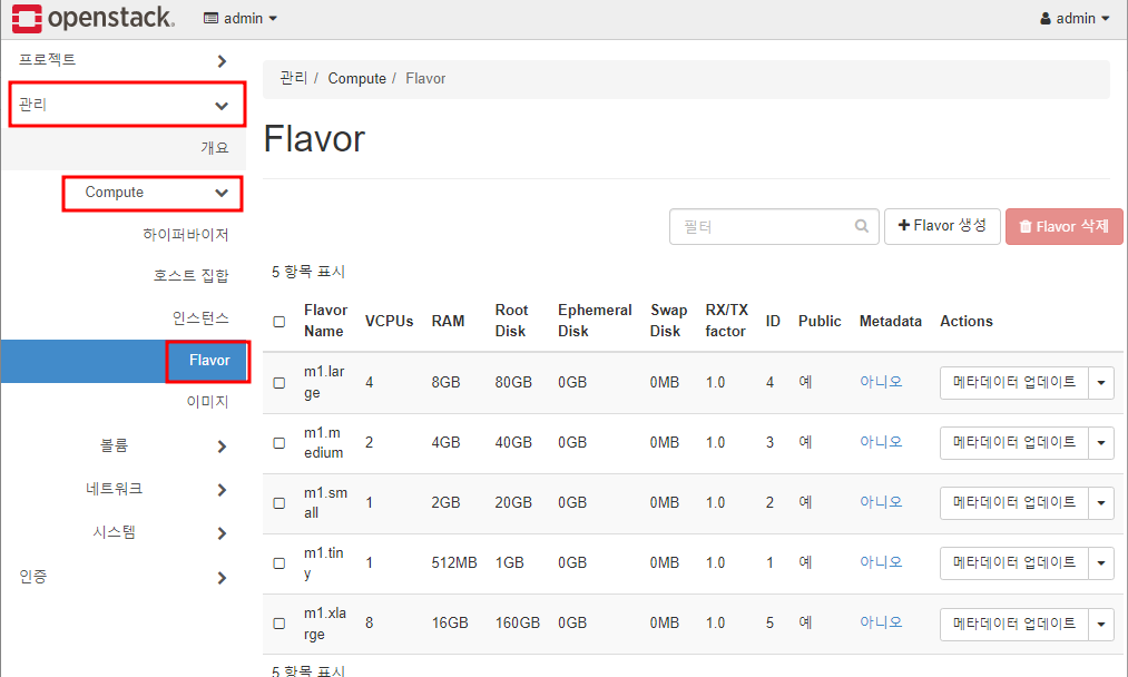 admin 탭이 아닌 일반 project 탭에는 flavor가 없다. 그래서 admin 권한이 없