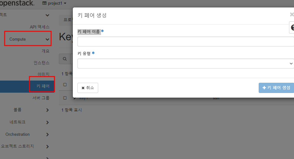 스텝13. Project > Compute > Key Pairs > Create Key Pair