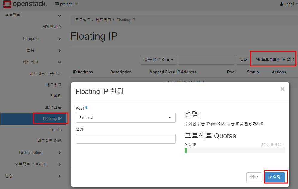 스텝12. Project > Network > Floating IPs > Allocate IP To Project