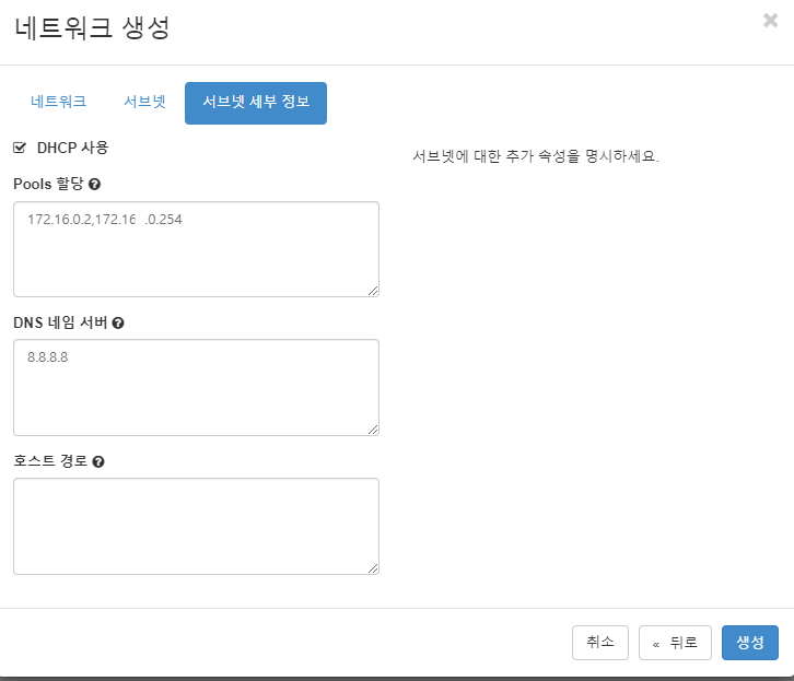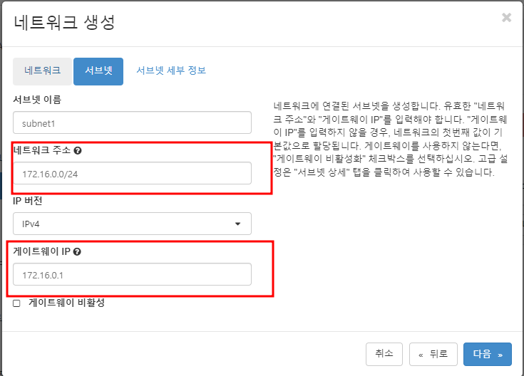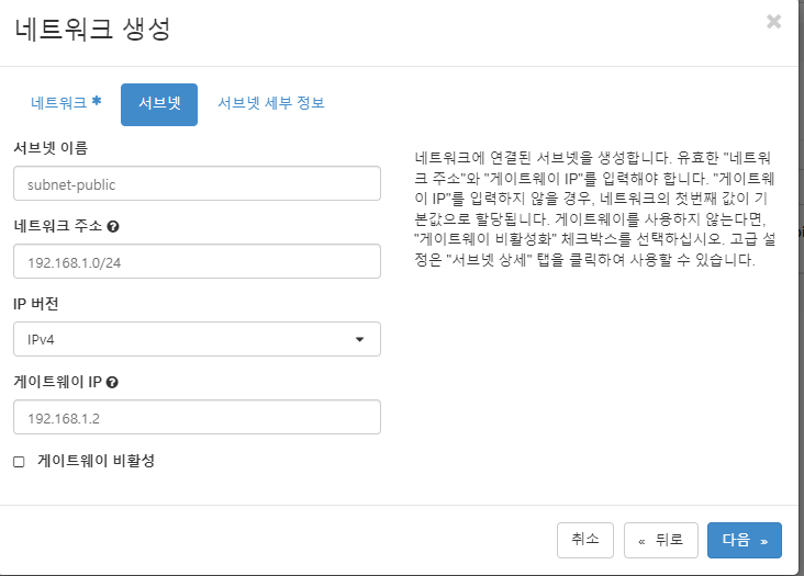 사설망을 세팅하는 것이기 때문에 게이트웨이는 내 맘대로 줄수있다. 알아보기 쉽게 1번으로 부여하려고 했는데 dhcp 옵션에 체크 하게되면 어차피 알아서 세팅되니까 비워두었다.