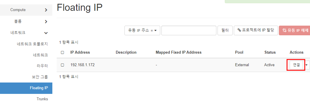 스텝15. Project > Network > Floating IPs > Actions : Associate