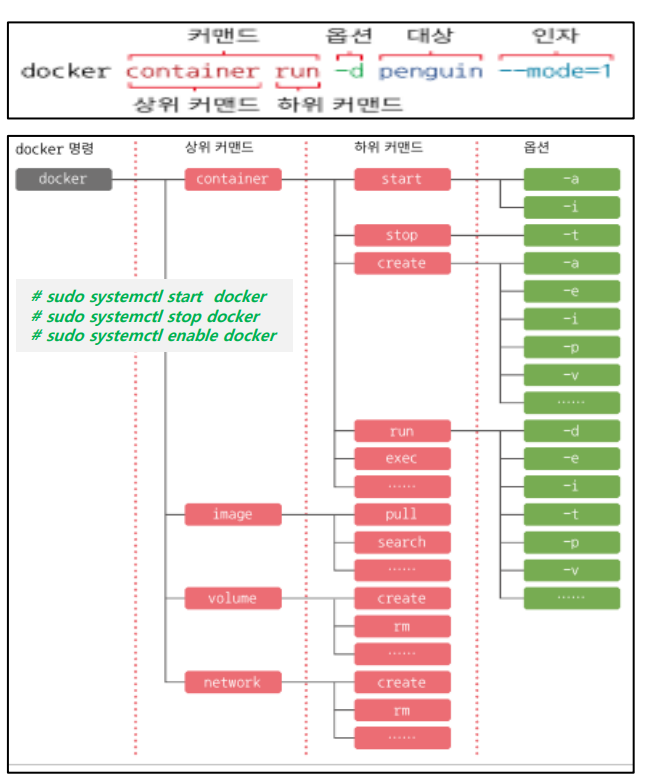 | version | 도커 엔진 및 명령행 도구의 버전을 출력 | 거의 사용하지 않음 |