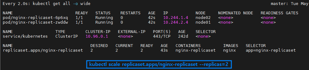 # kubectl scale replicaset.apps/nginx-replicaset --replicas=2