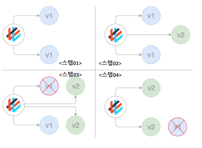 - 기존 버전의 서버를 하나씩 죽이고, 새로운 버전의 서버를 하나씩 띄우면서 순차적으로 교체하는 방법이다. 즉, 서버를 하나하나씩 버전을 업그레이드하는 방식