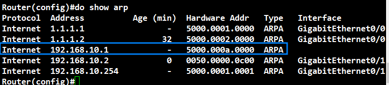 vIOs1(config)# arp 192.168.10.1 5000.000a.0000 arpa