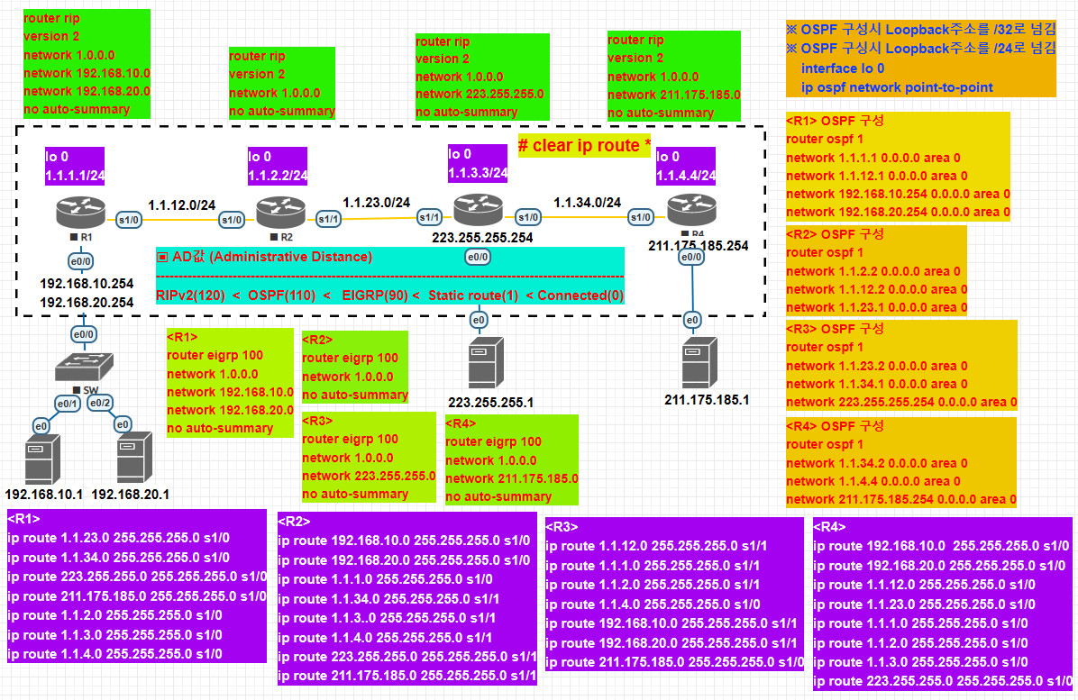 그것을 확인하기 위해서 rip, ospf, eigrp ,static 모두 다 적어줍니다.