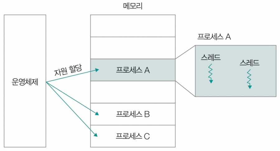 운영체제는 프로세스에 자원을 할당하고, 여러 스레드를 병렬로 실행시켜 멀티스레딩 및 멀티태스킹 환경을 구현합니다.