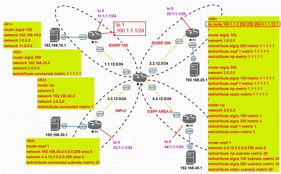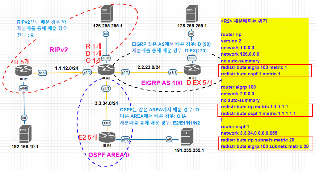 - 모든 라우팅 프로토콜에서 재분배시 지정하는 초기 메트릭 값을 문제가 생기지 않게 적당히 지정하는 것도 중요하다.