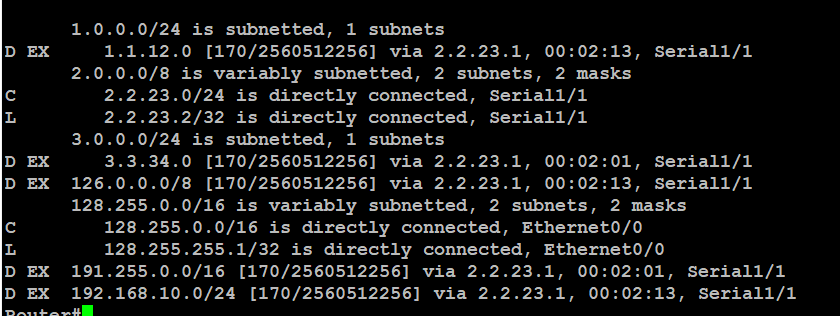 4.0.0.0/24 is subnetted, 1 subnets D EX 4.4.12.0 [170/2560512256] via 1.1.12.2, 01:46:09, Serial1/0
