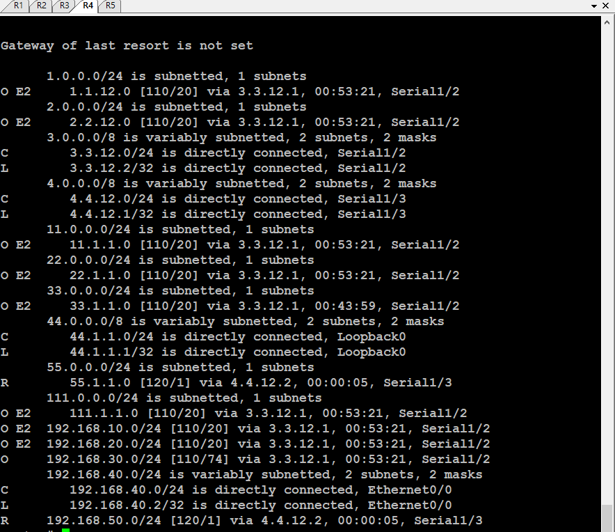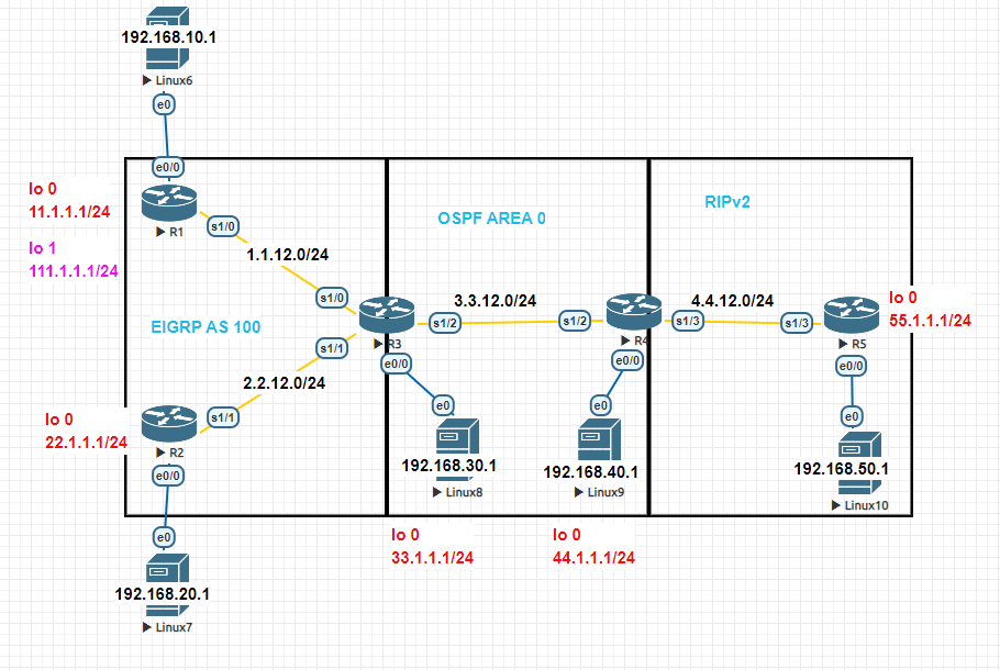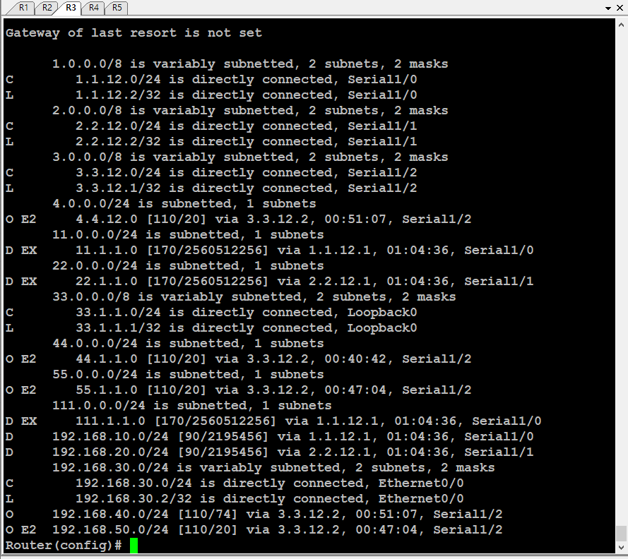 => 겹쳐져 있는곳 전부 다 해줘야 한다. R3에서는 EIGRP , OSPF 둘 다 connect로 재분배 해주어야 한다.