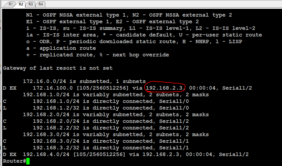 아래의 그림과 같이 172.16.100.0 via 192.168.2.3 의 방향으로 가게되는것을 확인할 수 있다.