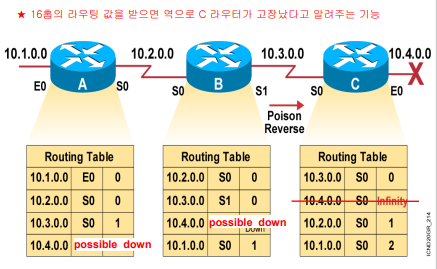 - Router C는 10.4.0.0에 대한 네트워크를’unreachable’ 이라고 미리 설정하지만 이웃한 라우터인 Router A,B는 계속적으로 이 경로에 대한 라우팅 업데이트를 수행한다. 하지만 Router C는 문제가 생긴 경로를 미리 Unreachable이라고 지정했기 때문에 Router B에서 이 경로에 대한 업데이트가 들어 오더라도 무시한다.