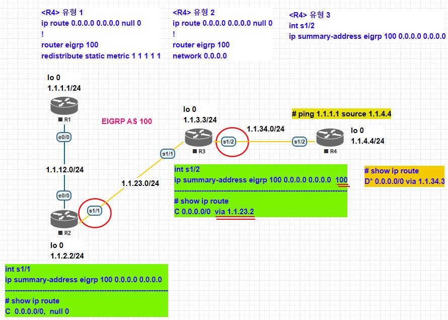 ip summary-address eigrp 100 [축약네트워크] [서브넷마스크]