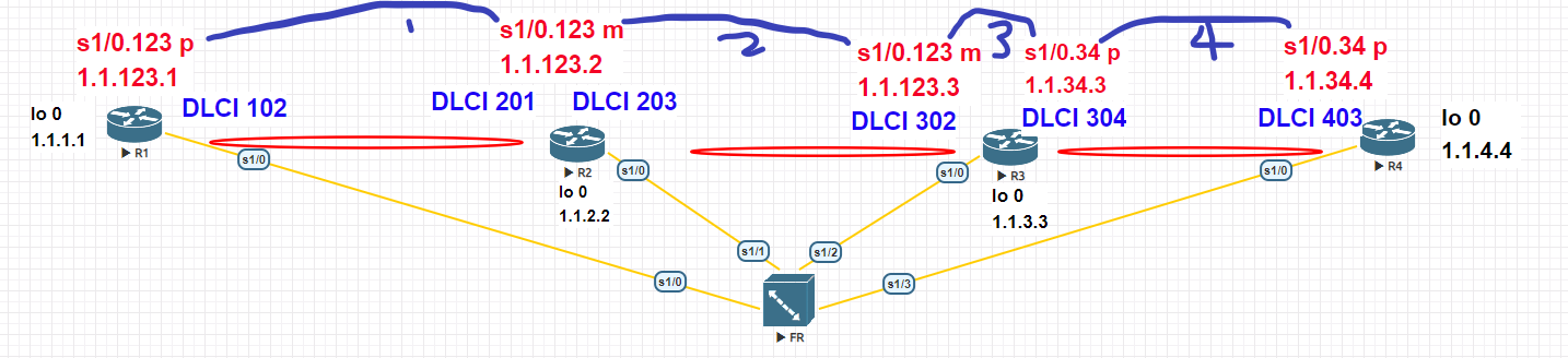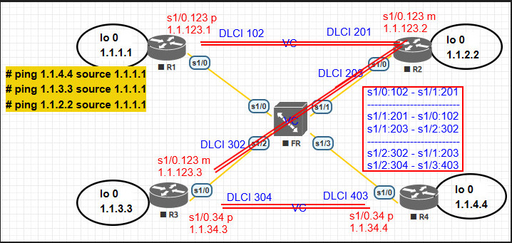 Router(config-subif)#frame-relay map ip 1.1.123.1 302 broadcast