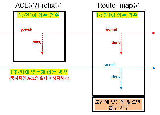 - access-list, prefix-list 처럼 route-map의 맨 마지막 문장도 묵시적으로 '나머지는 모두 차단하라'는 것이다.(★)