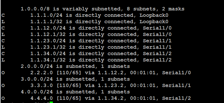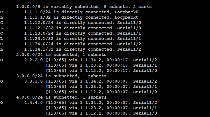 ospf 에 나타냈을 때 4.4.4.0 deny 조건이였던 주소만 수용되고 나머지는 모두 버려집니다.