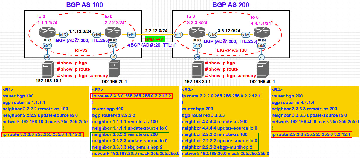 eBGP(AD : 20 ,TTL : 1 ) → 다른 as에 닿아있는 Router DMZ구간(누구의 소유가 아닌 구간)