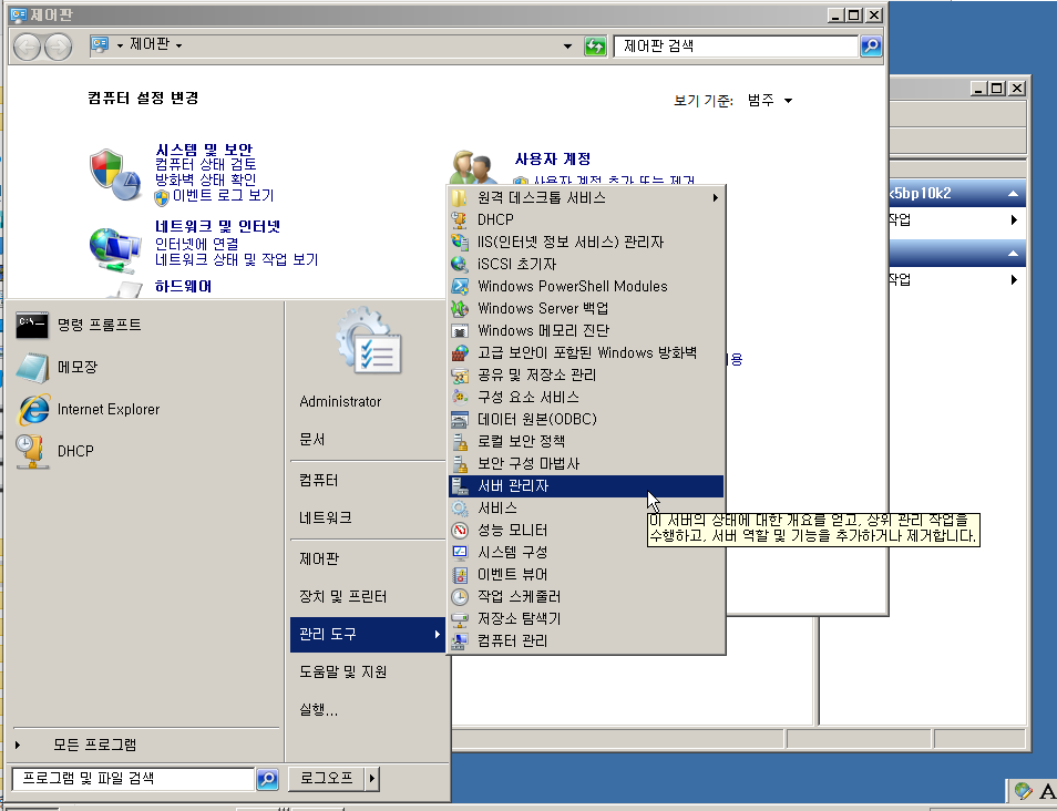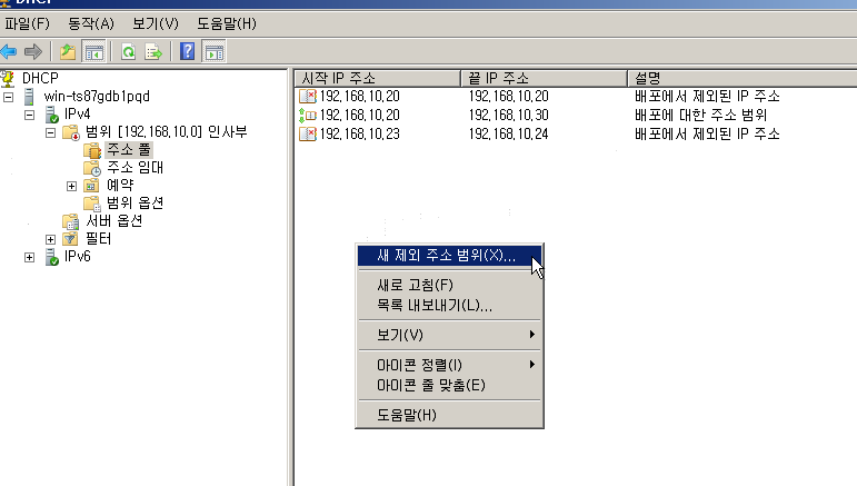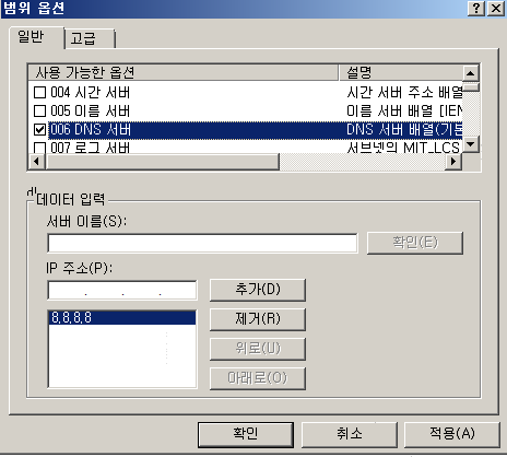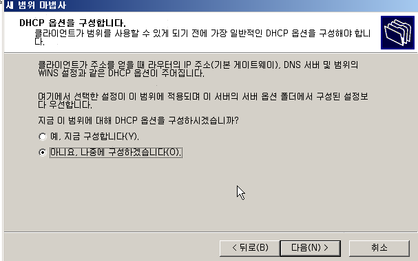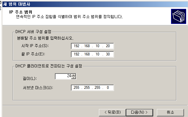 DHCP 서버를 클릭하여 설치 합니다. => 안의 설정사항은