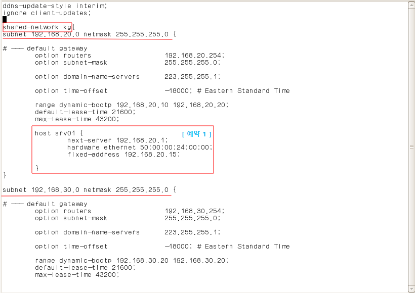 vi /etc/dhcpd.config 에 내용을 추가해준다.