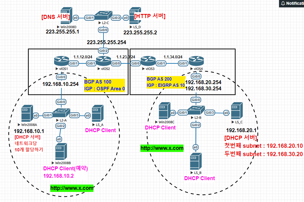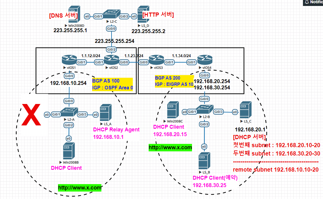 최종 결과로 dhcp 서버들에서 http://www.x.com으로 으로 통신이 잘 되어야 한다. 1.router구성하기 [vios1] int g0/0 ip add 192.168.10.254 255.255.255.0 no sh int g0/1 ip add 1.1.12.1 255.255.255.0 no sh router ospf 1 network 1.1.12.0