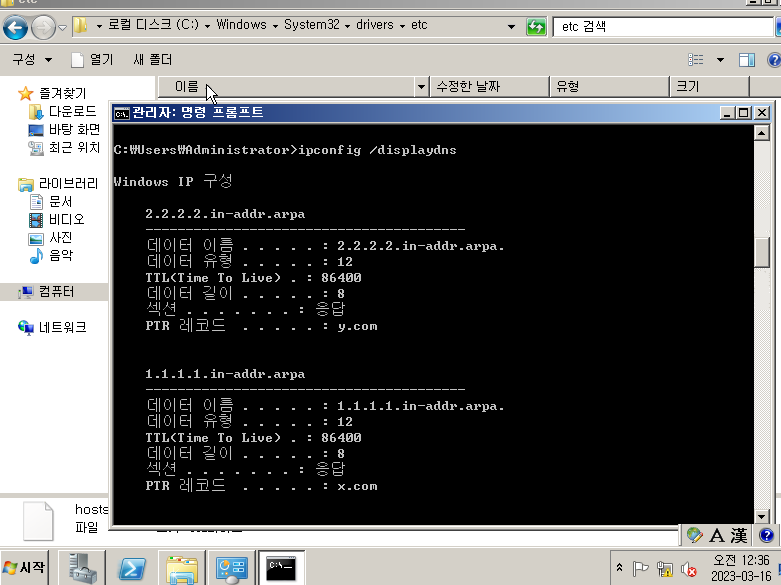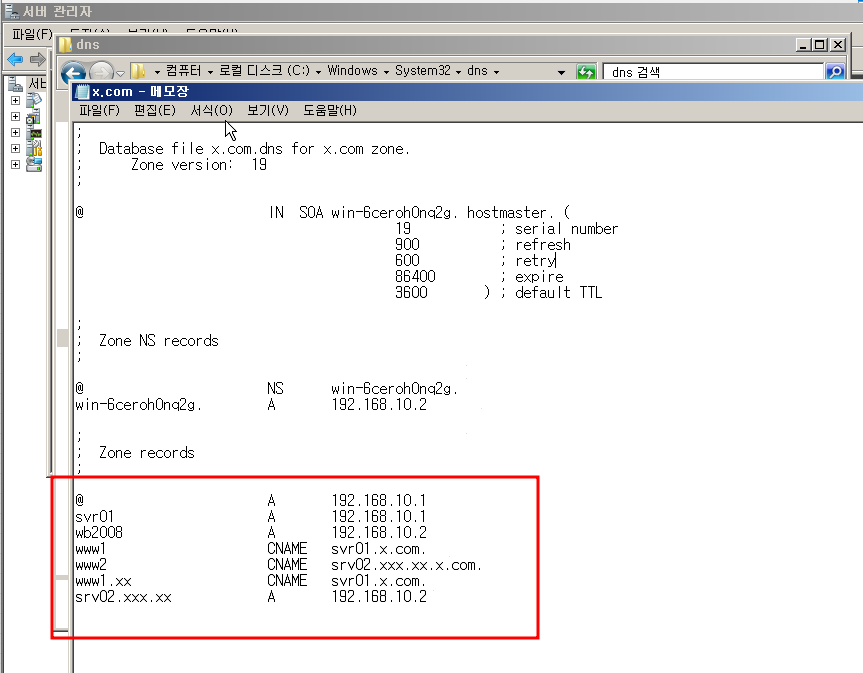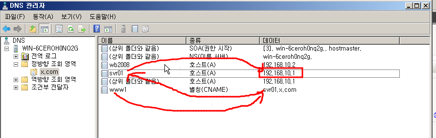 DNS관리자에서 만들어준 별칭과 호스트들은 위의 그림과 같이 적혀있다.