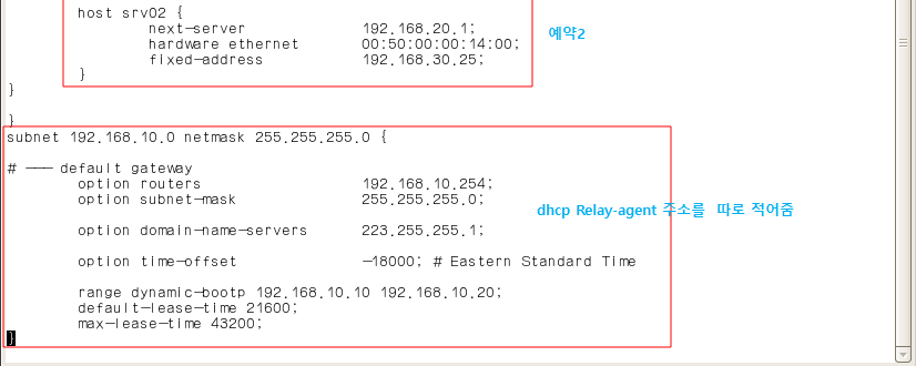 vi /etc/dhcpd.config 에 내용을 추가해준다.