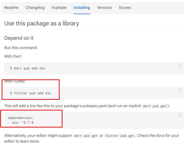 cmd 화면에서 설치 명령어를 넣거나, pubspec.yaml 파일에 depencey를 추가한 후 , pub get해준다.