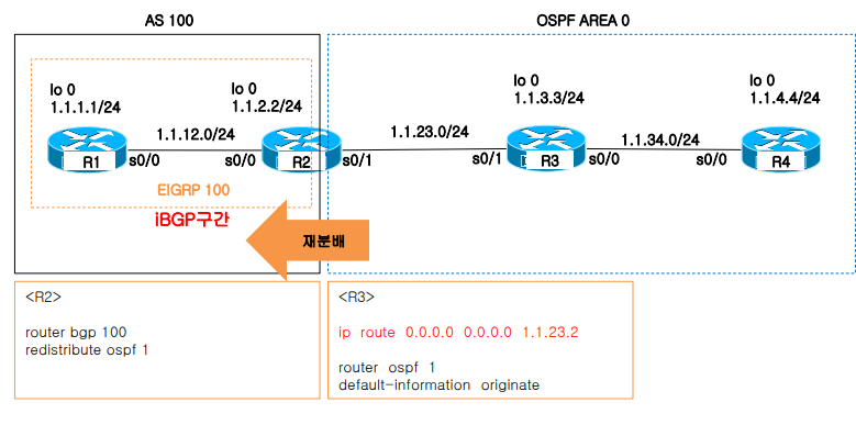 일반적으로 IGP정보를 BGP로 재분배를 시키고, BGP정보는 IGP로 재분배 하지 않는다.