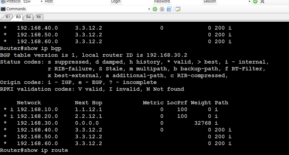 ○ Status codes (show ip bgp 앞 부분) IGP들은 AD 경쟁에서 탈락하여 라우팅 테이블에 인스톨시키지 못한 네트워크는 인접 라우터에게 광고하지 않는다. 그러나, 시스코 라우터에서 BGP는 라우팅 테이블에 인스톨되는 것과는 상관없이 해당 라우터의 BGP 테이블내에서 최적 경로 (best route)이면, 즉 'r' 표시가 된 경로라도 네이버에게 광고한다.